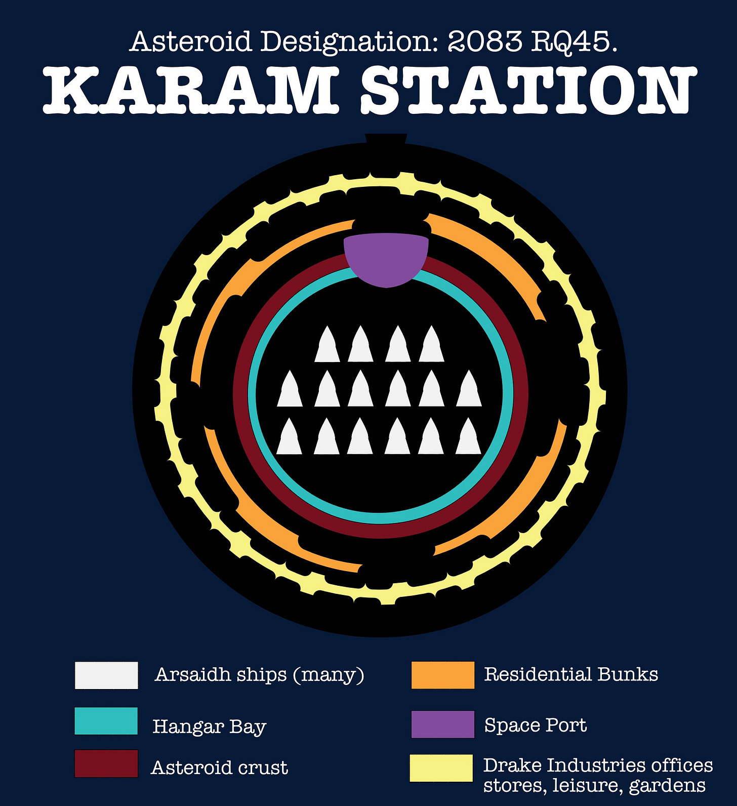 So what we have is a hollowed-out asteroid filled with hundreds of ships that once belonged to an ancient alien race about which we know almost nothing. Discovered by Drake Industries in 2078, they have developed the asteroid with an outer belt containing an inner ring of residential units, and an outer ring that includes all manner of leisure, commercial, and corporate offices, businesses, and storage.